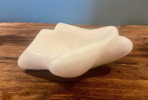 Also tat ich das. Ich ließ los, was ich dachte, erschaffen zu müssen. Ich hörte auf zu planen. Und ich fing an, mit dem Stein zu sprechen. Nicht laut, keine Sorge. (Das hätte definitiv dazu geführt, dass mich Sonja, die anderen Teilnehmerinnen inklusive meiner Tochter komisch anschauen. 😂) Aber innerlich. Und „plötzlich“ – nach viel Hämmern und Feilen am groben Stein – war sie da: die Form. Ganz sicher kein gewaltiges Kunstwerk, keine spektakuläre Meisterleistung. Sondern eine kleine Skulptur, die an eine Schale erinnert. Weiche, geschwungene Formen, die sich ineinander fügen. Mit einer Vertiefung auf der Oberseite – wie die einer Schale. Eine Form, die empfängt. Die einlädt, statt sich aufzudrängen. So zumindest mein bescheidenes Lob über mein Ergebnis. ☺️